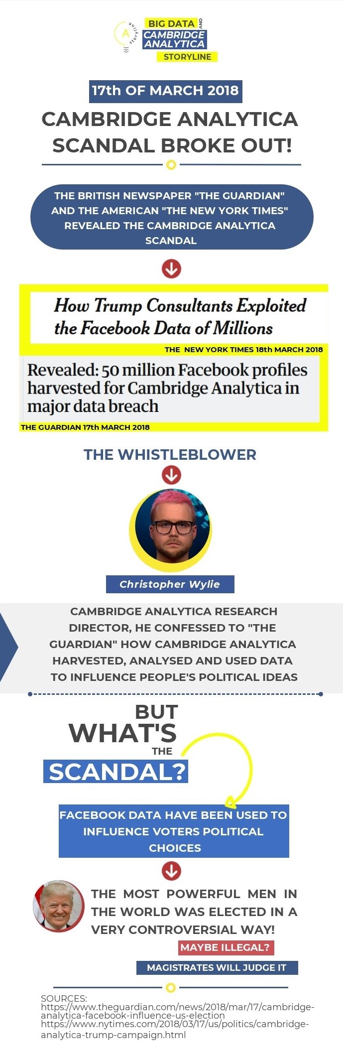 On the 18th of March, the Observer (weekly magazine of the Guardian) and the New York Times released their inquiries. They accused Cambridge Analytica to have collected personal data without authorization and use them to influence people political opinions. Moreover they accused Facebook not to have done anything to avoid data collection. Indeed, if a business makes something against Facebook terms and conditions, Facebook delete completely their social pages. But nothing happend for more than 2 years, so the questions is: did FB know everything and didn’t do anything, or has been FB unable to discover the leak??? It’s dangerous in both cases.