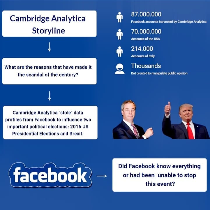 At the end we are going to deal the story of Cambridge Analytica, how this software started to use people data and why they are suspected of influencing political orientations. They did not work only for USA President Elections but they were hired also for Brexit referendum.